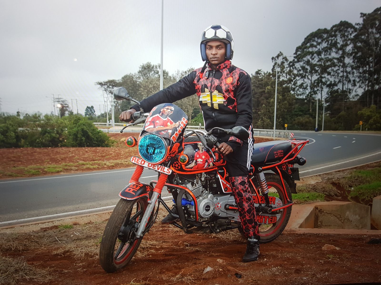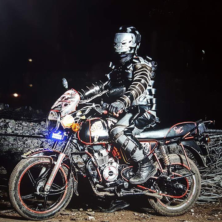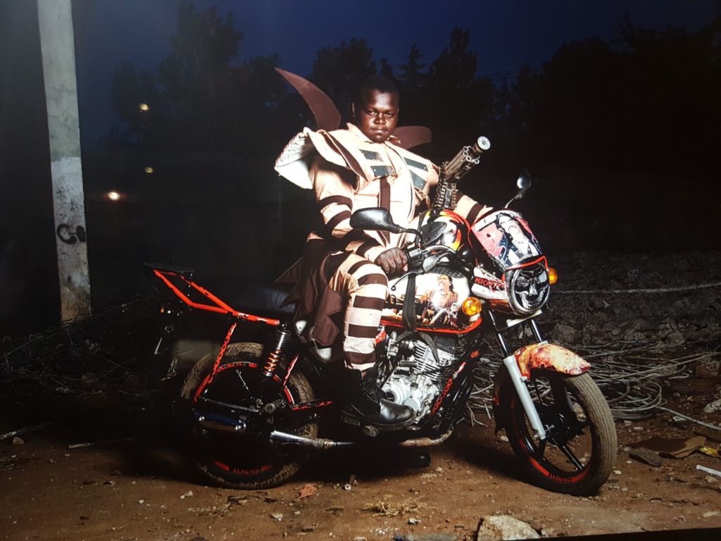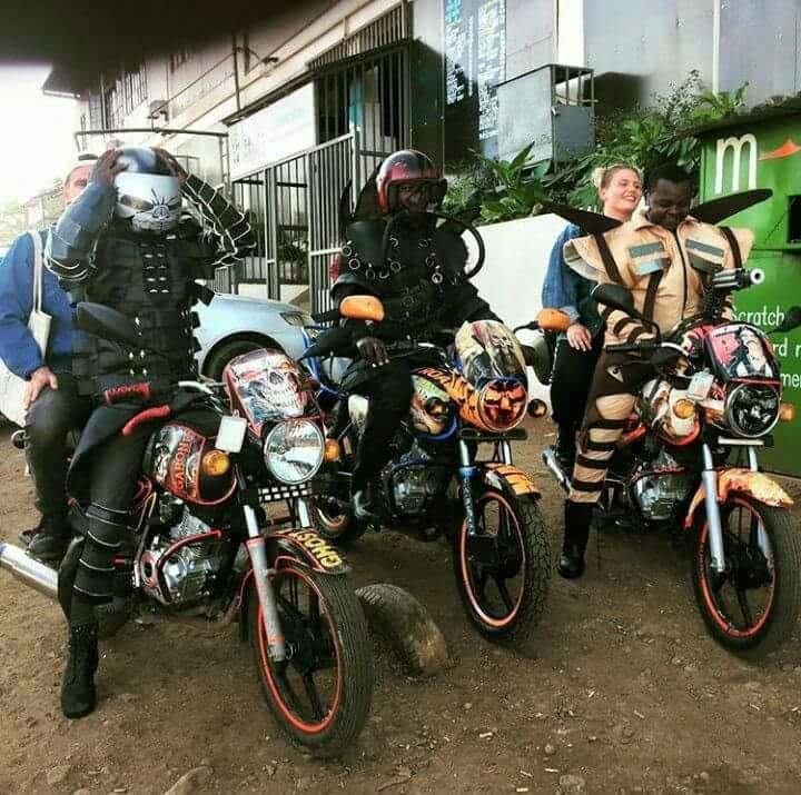 Bobbin Case, a Ugandan fashion designer based in Nairobi sought inspiration from animals, football, movies and more to design costumes for 7 boba boda riders, who were then photographed for this fashion story. Each of them was given a name according to the inspiration of their costume. They included Madmax rider, Machette rider, Vibes Kartel rider, Ghost rider, Lion rider and Man U rider.