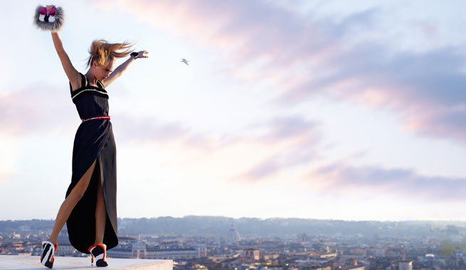 For Cara’s FENDI camapign she goes on a Roman Holiday with model Saskia De Braw, as the pair pose in FENDI furs and vibrant sky scraper heels on a rooftop in Roma. The campaign called ‘Roman Skyline’ was shot by the one and only Karl Lagerfeld. Fashion’s kaiser said of the ad: ‘For our 2013-2014 Fall/Winter season, we sought to celebrate the love between FENDI and Rome with a very feminine campaign evoking a chic and modern Roman holiday.’