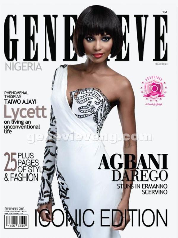Former Miss World, Agbani Darego is the cover girl of the September issue of Nigeria’s glamorous magazine Genevieve. The former beauty queen who is famous for her stunning legs covers the iconic issue of the fashion rag clad in a dress by Italian designer Ermanno Scervinno.