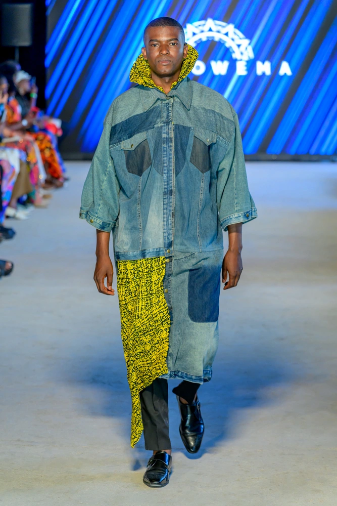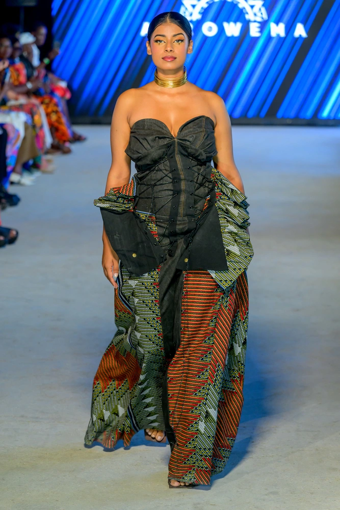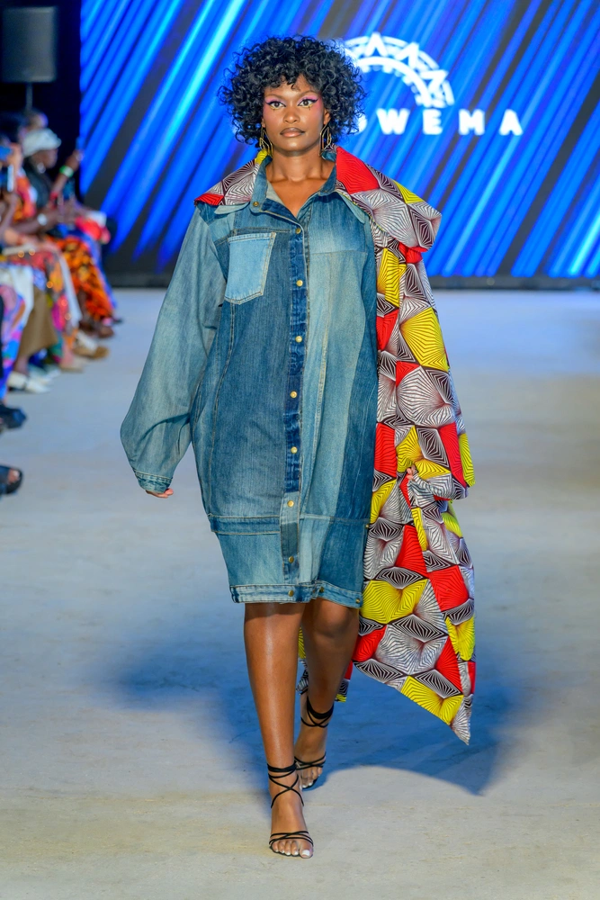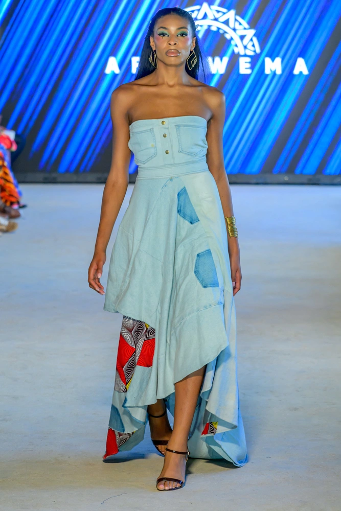 Each piece told a story of transformation and pride. AfroWema worked with Mr. Green Africa to source upcycled denim, collaborated with Kenyan cooperatives to create ethically woven cotton, and incorporated rare Kitenge fabrics from Ghana and Nigeria. All of this was brought to life through co-creation with artisans from Kibera, Nairobi’s largest informal settlement. Models walked the runway in sculpted denim gowns, flowing cotton dresses, and richly patterned ensembles that blended traditional motifs with modern silhouettes.