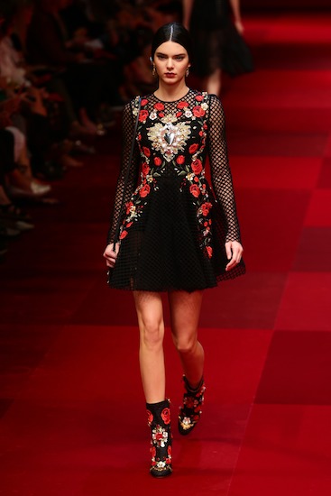 With her lean legs on full display, Kendall was certainly the center of attention as she strutted down the catwalk with ferocious intensity and focus. Dolce & Gabbana’s Spanish-inspired line of delicately embroidered red, high-waisted briefs accentuated Kendall’s statuesque frame, while her dramatic makeup, including dark red lips, highlighted her striking facial features.