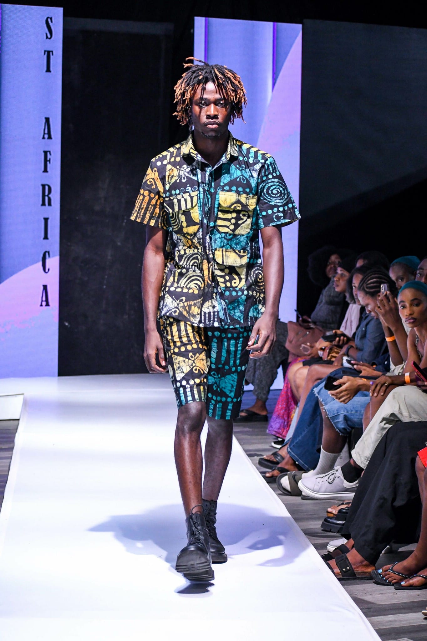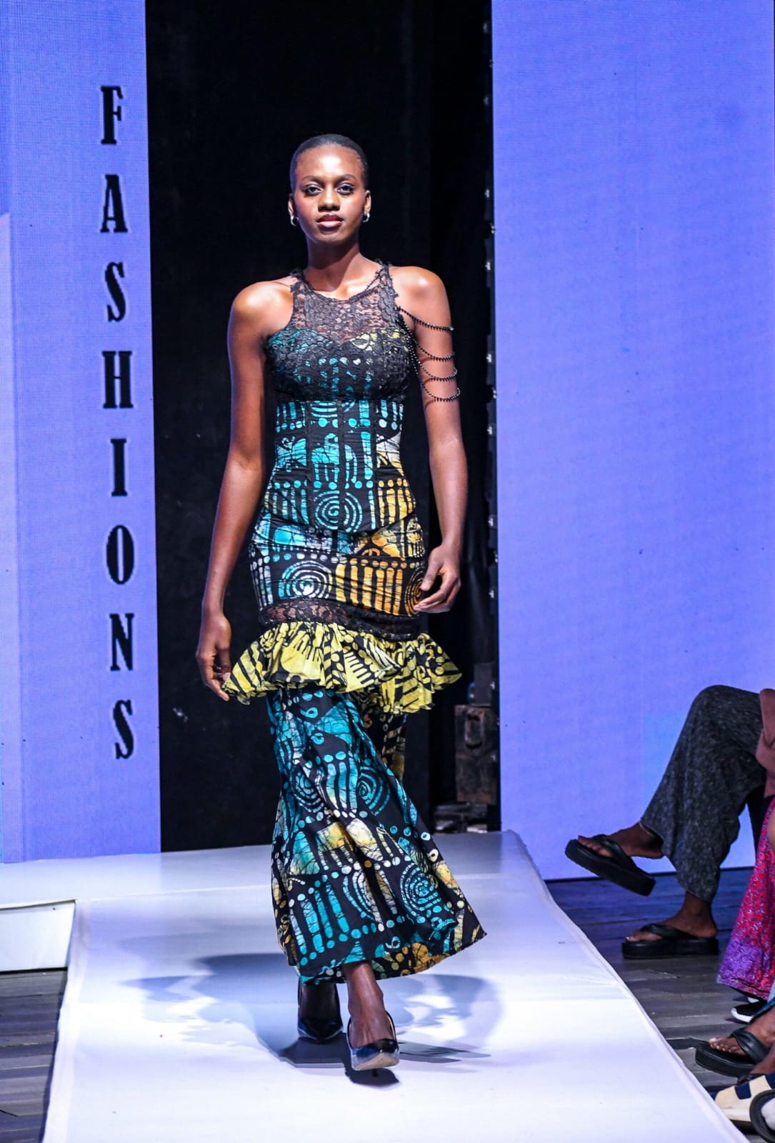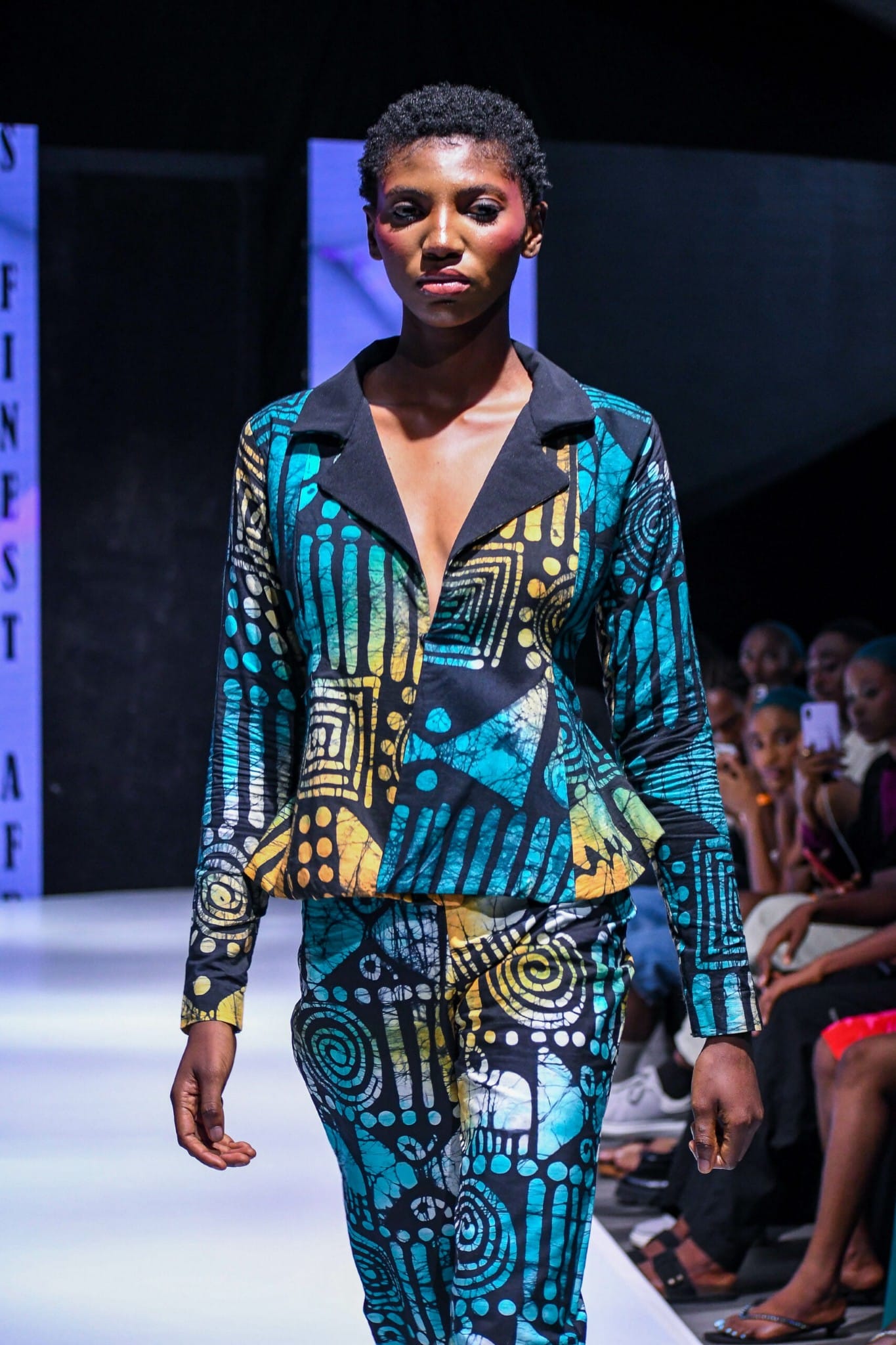 Few pieces on the runway felt as declarative as Nella Stitches’ printed pantsuit, an unflinching homage to the unity and diversity of Africa. Rendered in a kaleidoscopic motif echoing the topographical and cultural richness of the continent, this pantsuit did more than flatter the form it communicated.