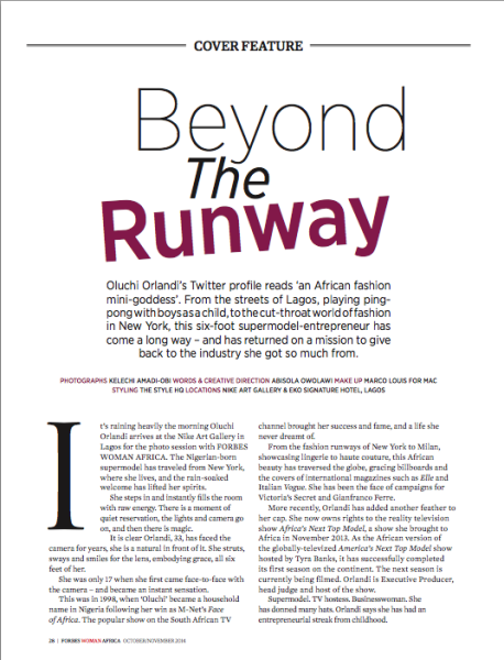 To celebrate its first anniversary, Forbes Woman Africa magazine has tapped supermodel and Africa’s Next Top Model mentor Oluchi Orlandi for the cover.