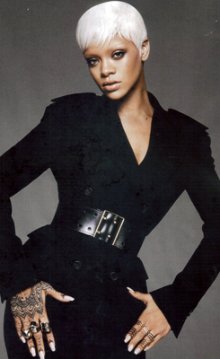 Though, it does shed light on her sartorial musings. For one, Rihanna, the “S&M” singer, doesn’t mind pain. “It’s not about pain,” she says referring to her penchant for 4″ heels. “It’s about the commitment. I say to myself, ‘I want to look like this,’ and worry about the pain later.” Looking like “this” consists of “bad b*tch” style, a man’s jacket, and fake jewelry. “My jewelry’s all fake — from Claire’s. Or I get it from my mom’s boutique in Barbados,” she confesses.