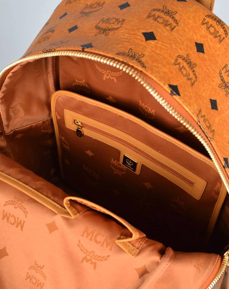 Why: This leather backpack was designed with the stylish young man in mind. The MCM backpack in rich faux leather, detailed with a classic monogram print. The two-way top zip opens to a lined, 3-pocket interior with a padded laptop sleeve. Zip front pocket and studs at the pouch side pockets. Rolled handle and adjustable, padded shoulder straps. The bag is also available in Black, Blue, and Red.