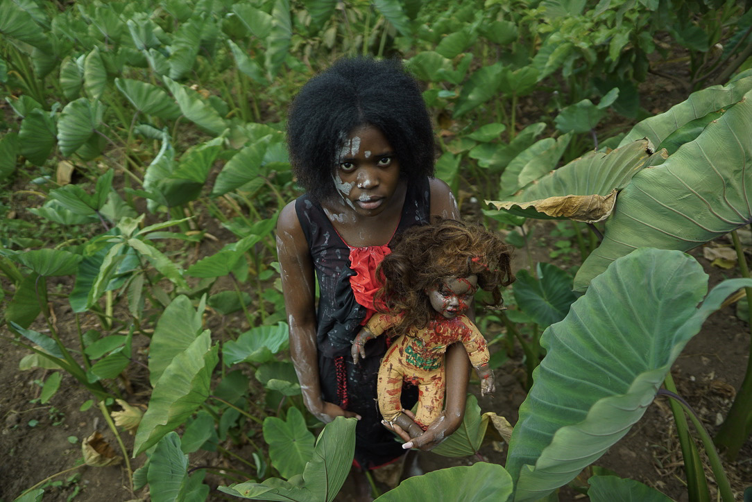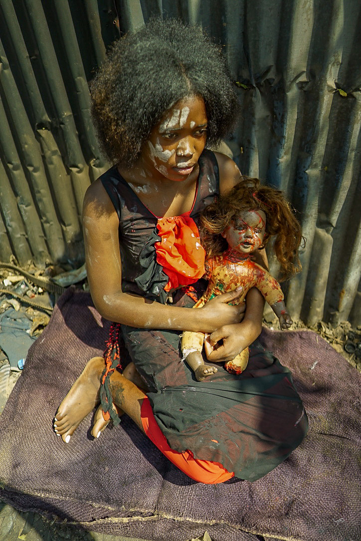 • The Survivor appears in deep reds and blacks, with elements such as ropes and head coverings symbolizing abduction, captivity, and endurance. This look honors survival while acknowledging lasting trauma.