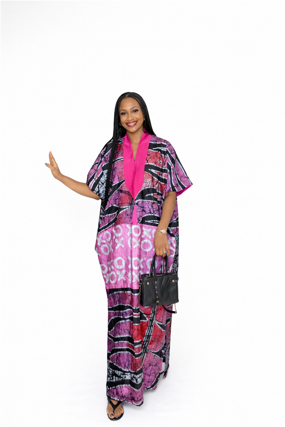 A particularly notable look appears in a burgundy and grey Adire kaftan, where a large diamond motif dominates the surface of the garment. Rather than dispersing patterns evenly across the fabric, the designers place the motif strategically at the centre of the composition, creating a visual structure that draws the eye vertically along the body. A subtle slit at the front introduces movement, giving the otherwise voluminous silhouette a sense of lightness.