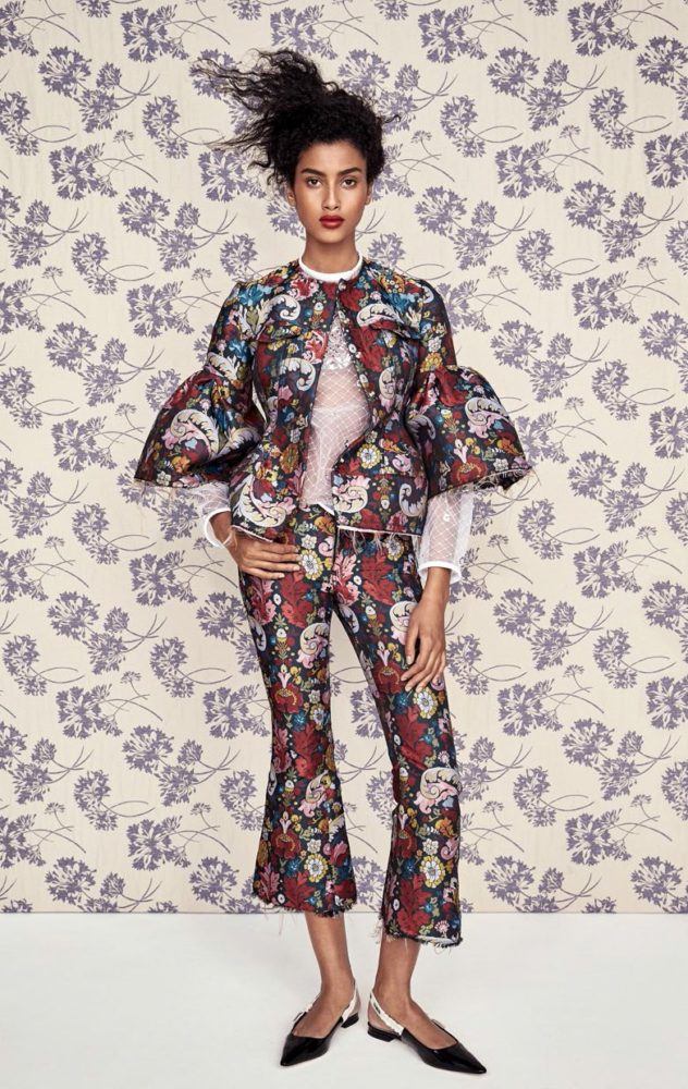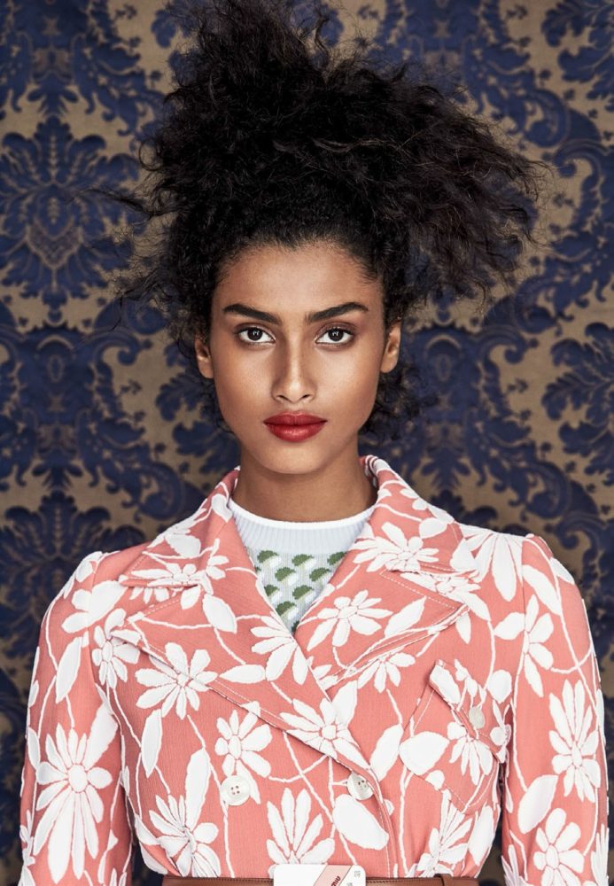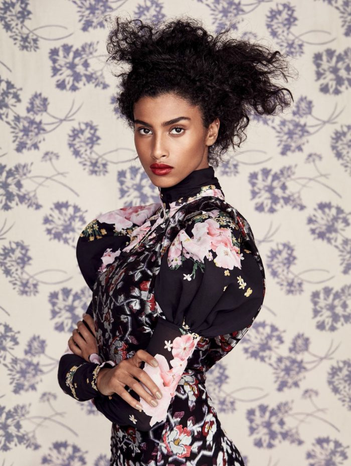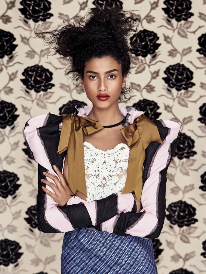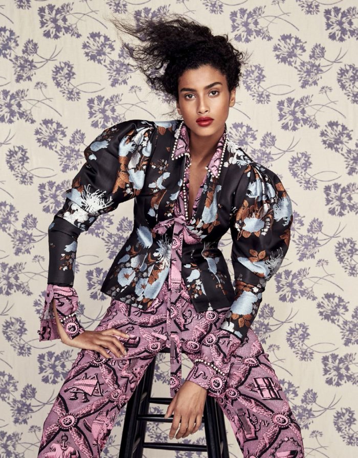 Top model Imaan Hammam is styled by Daniela Paudice in romantic interior-design prints and patterns in ‘Wall Flower’, lensed by Patrick Demarchelier for Vogue China March 2017.