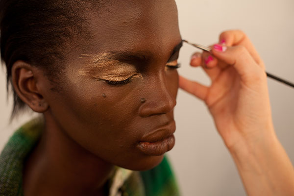 Gilded refers to everything metallic from the deepest copper to the warmest gold. We designed looks where different types and textures of makeup were used for various effects. From traditional makeup powders, molten liquids and paints to gold leaf; the idea was to explore depths and dimensions and use makeup as art.